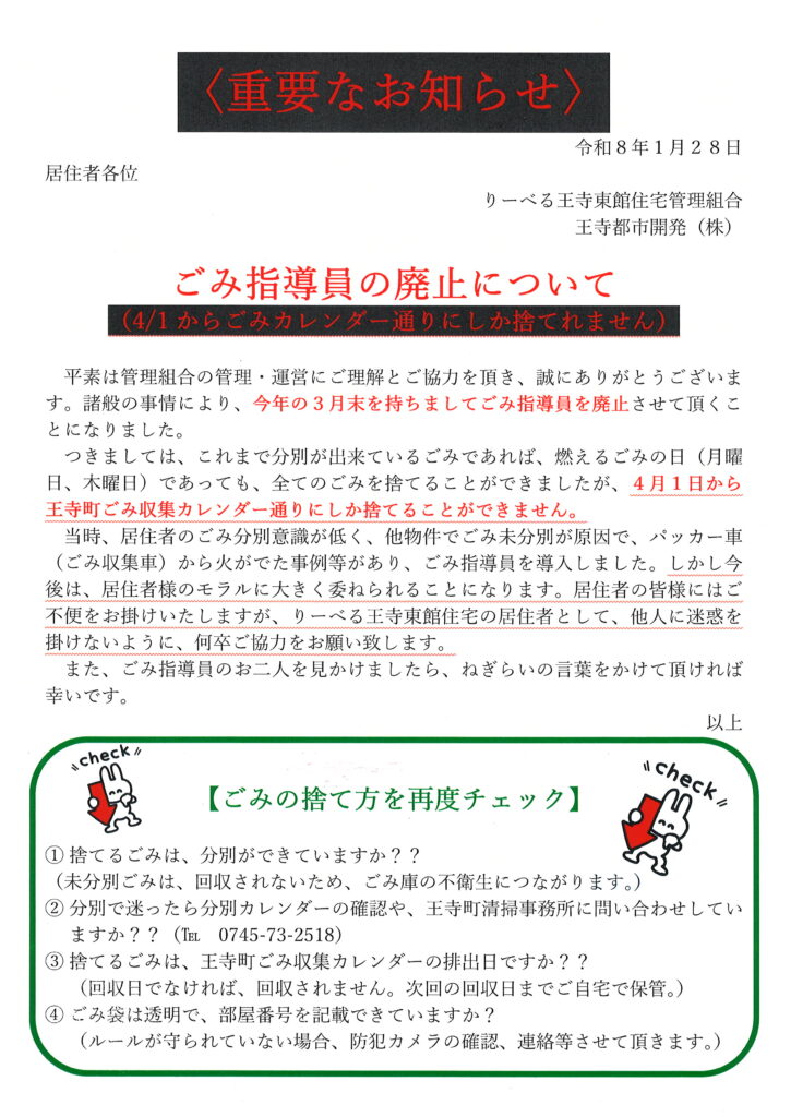 りーべる王寺東館「住宅管理組合総会の結果」のお知らせ