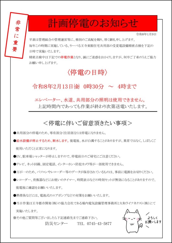 りーべる王寺東館住宅共用部「計画停電」のお知らせ