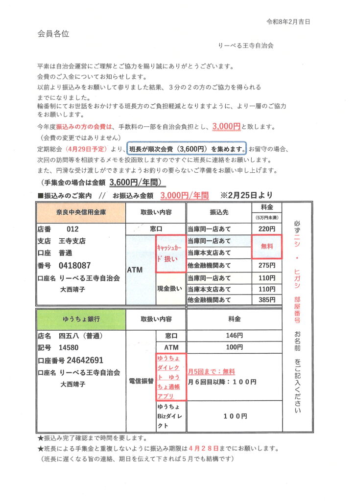 自治会費は口座振り込みがお得